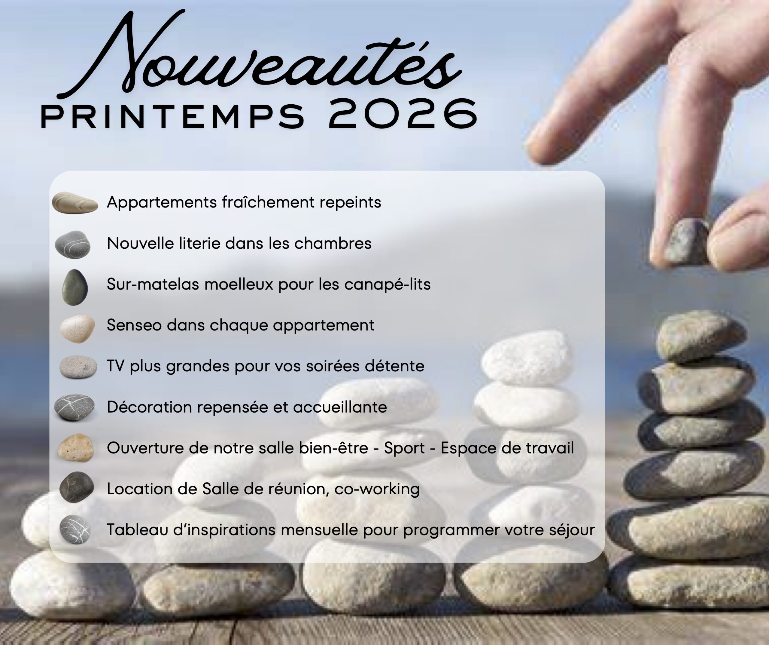 Découvrez le confort et la commodité de nos appartements, dont la taille varie du studio au trois-pièces. Chaque unité dispose d’équipements modernes et d’une vue imprenable, parfaite pour une escapade.